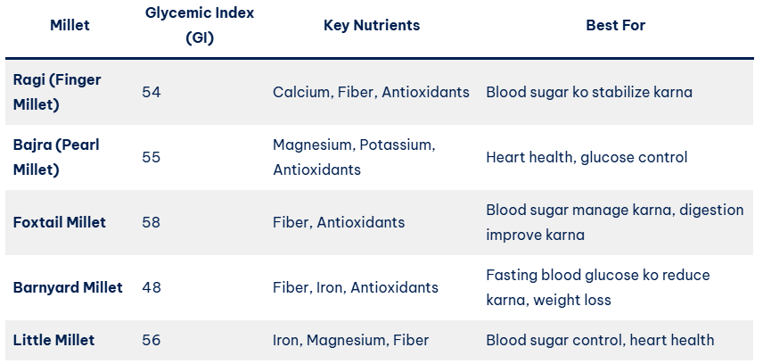 Ek study ne yeh bhi show kiya hai ki low GI foods, jaise millets, regular consumption se blood sugar levels 14% tak reduce ho sakte hain (Ref: American Journal of Clinical Nutrition).