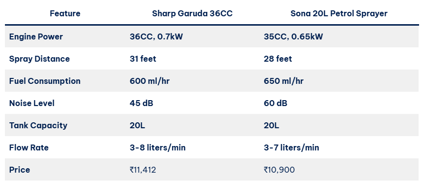 Ab dekhte hain Sharp Garuda ko Sona 20L Petrol Sprayer ke saath kaise compare karta hai: